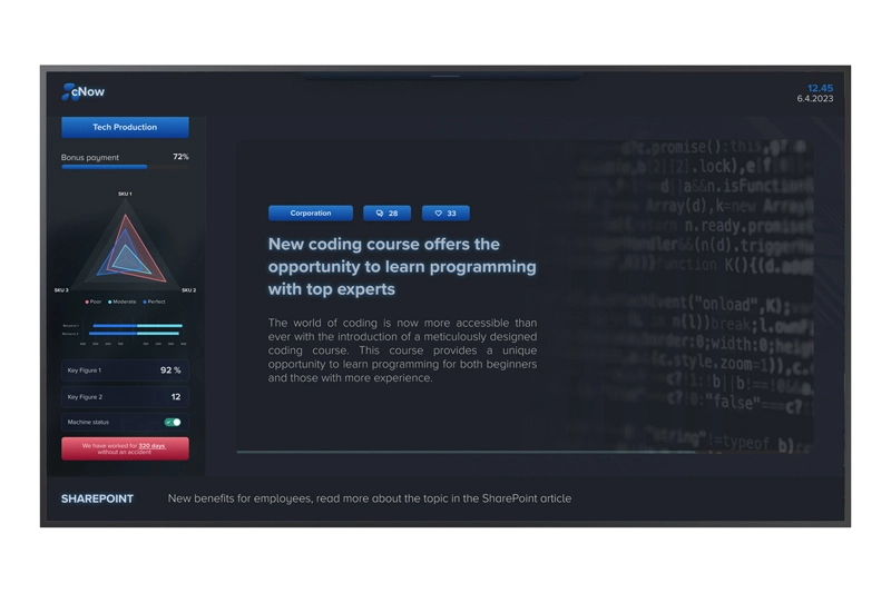Hyödynnä cNow infonäyttöä tehokkaasti keräämällä tietoa useista sovelluksista yhteen paikkaan. cNow toimii keskuksena työyhteisöviestinnälle ja eri ohjelmistojen tuottamalle datalle, tarjoten kaiken tarvittavan tiedon työntekijöille ilman useiden eri ohjelmistojen hallintaa.