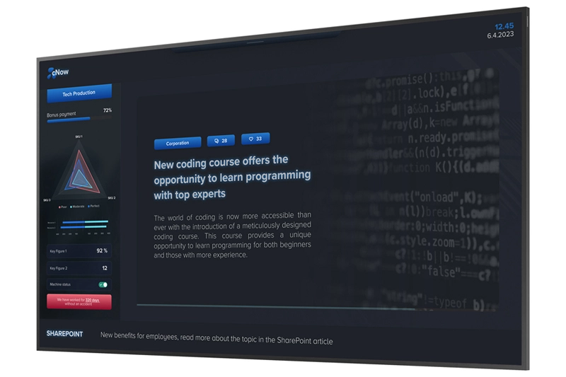 Näytä ajankohtaisia uutisia ja tärkeitä lukuja helposti ja automaattisesti infonäytön avulla. Tämä tehokas viestintäkanava lisää työntekijöiden sitoutumista ja luo yhteisöllisyyden tunnetta.